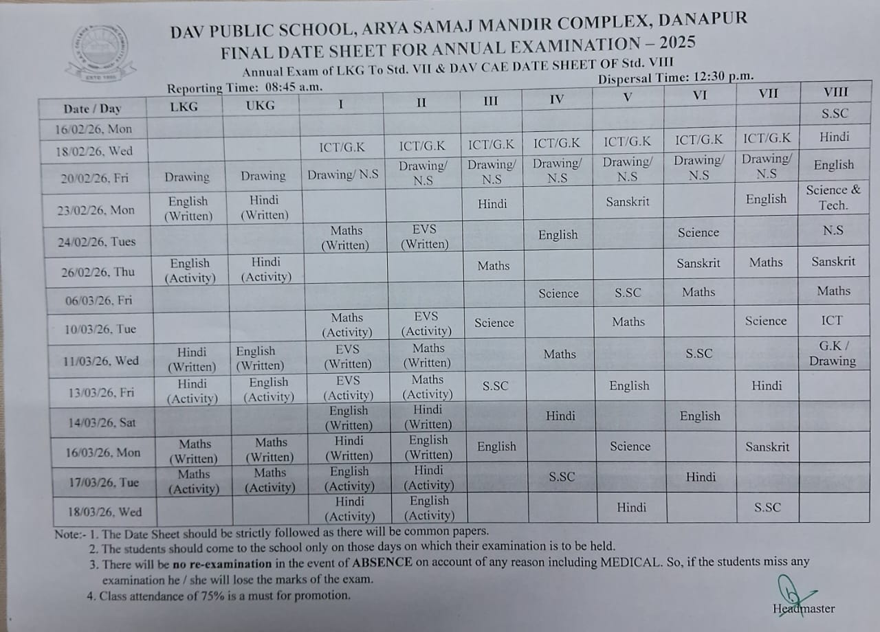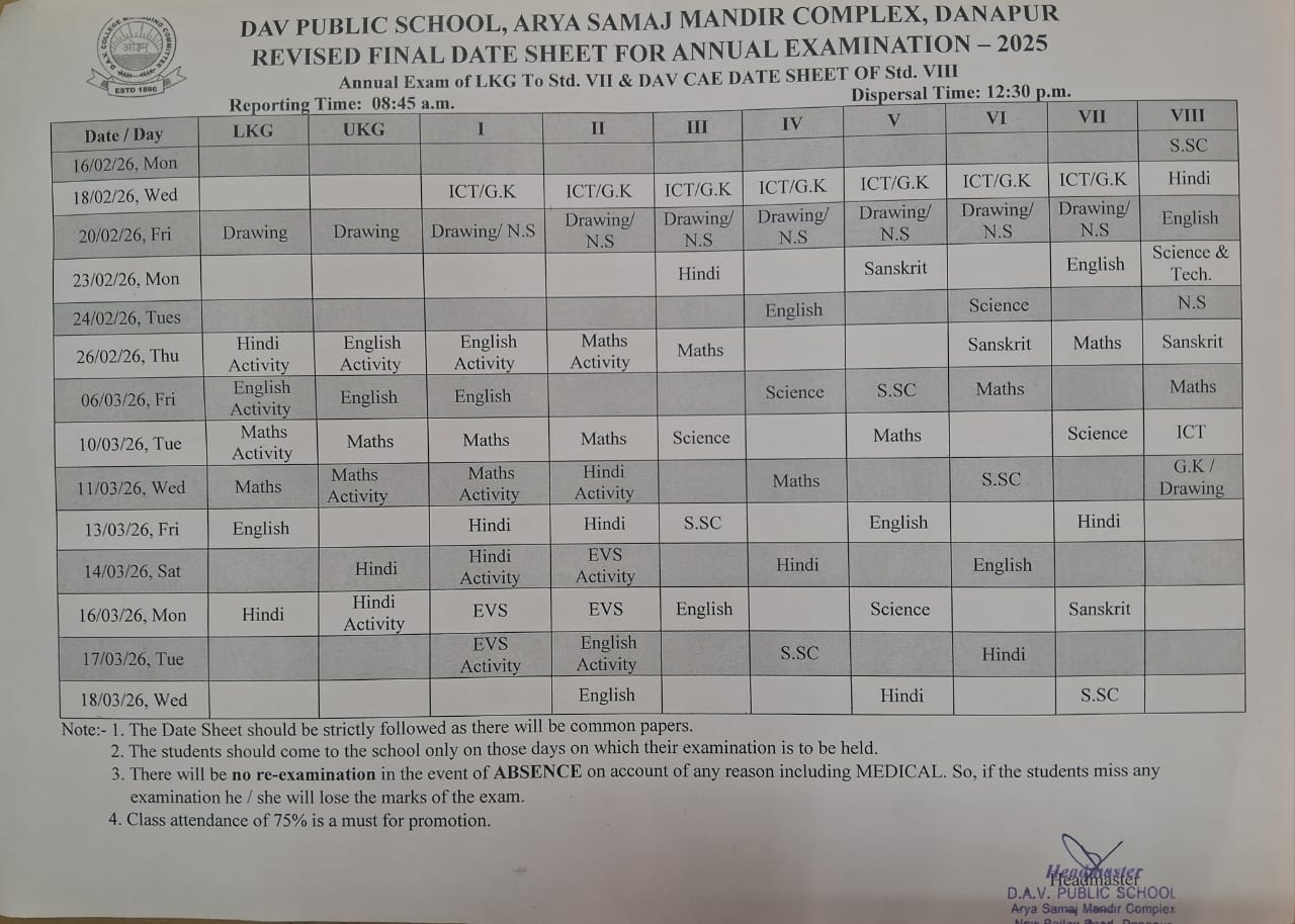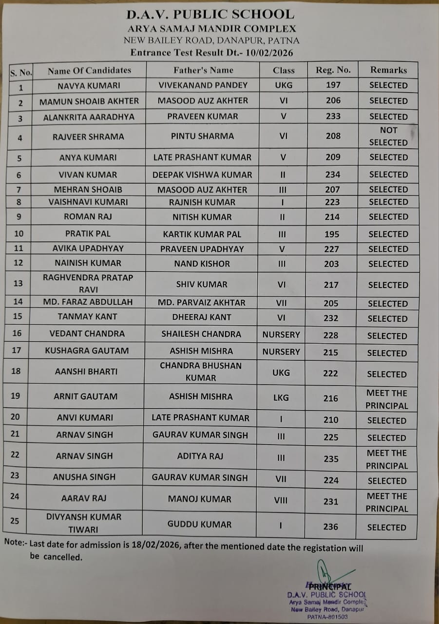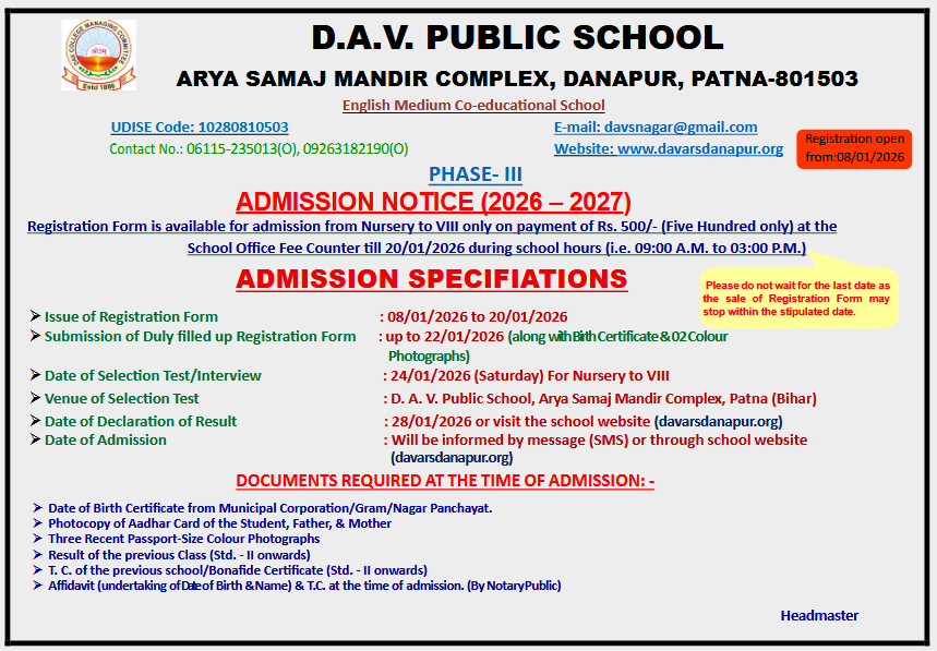 D.A.V. PUBLIC SCHOOL, ARYA SAMAJ MANDIR, DANAPUR, PATNA -801503 has started functioning in this building from 1st April, 2016 & it is directly managed by DAV College Managing Committee, New Delhi. This School was earlier in reneted building from April 1993 at Post Office Road,